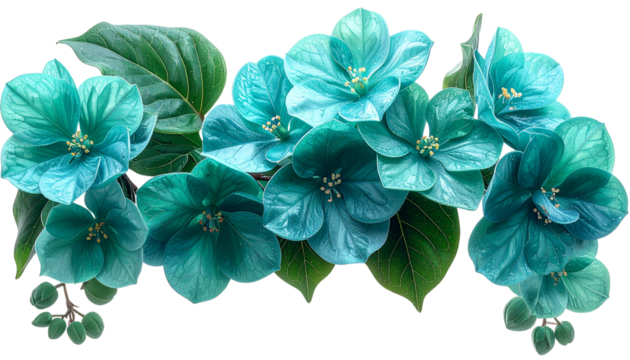 Rare jade vine flowers cascading in turquoise-green clusters, crystalline petal texture, vibrant tropical color palette, studio-lit realism, isolated on transparent background, PNG.