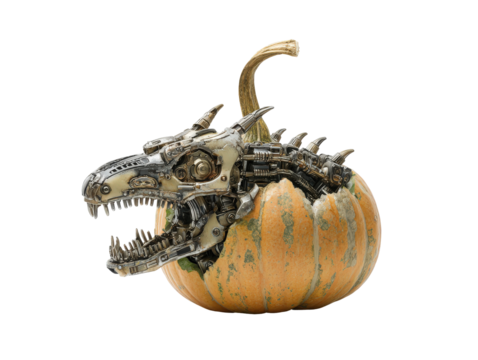 A mechanical dinosaur head with sharp teeth and horns emerging from a cracked orange pumpkin.