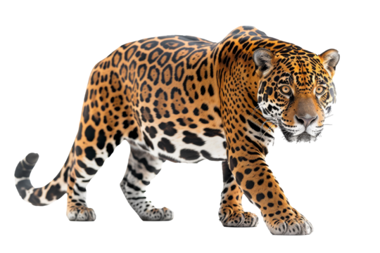 Close-up of a majestic jaguar walking towards the camera on a white background, showcasing its stunning fur pattern and intense gaze.on transparent background