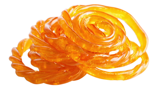 A small pile of Indian dessert jalebi in spiral swirls and coated in sugary syrup isolated on transparent background