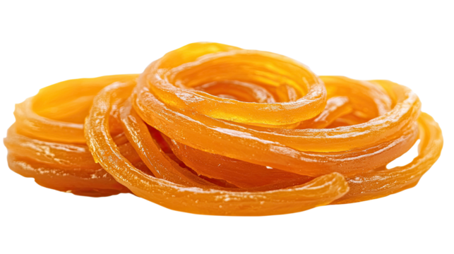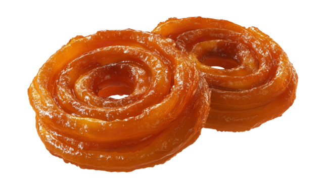 Indian sweet jalebi, a traditional snack food. Spiral shaped fried dough, soaked in sugar syrup. Orange, yellow, and crispy jalebi on a isolated transparent background. Alpha mask cut out png.