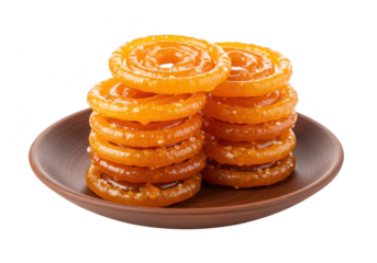 Crispy bright orange jalebis stacked neatly on a rustic brown ceramic plate glistening with syrup isolated on transparent background