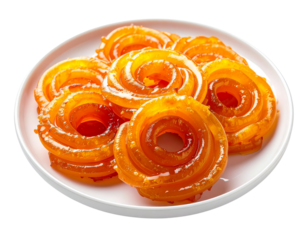Traditional Indian jalebi dessert served on white plate with crispy texture and golden syrup glaze isolated on transparent background