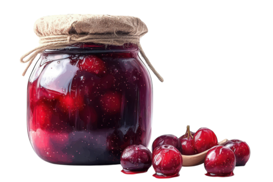 Homemade cherry jam preserves the warmth and sweetness of summer days with a classic jar on transparent background