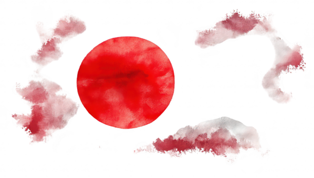 A watercolor illustration of the Japanese flag. featuring a red circle symbolizing the sun on a white background. evoking a sense of national pride and cultural identity