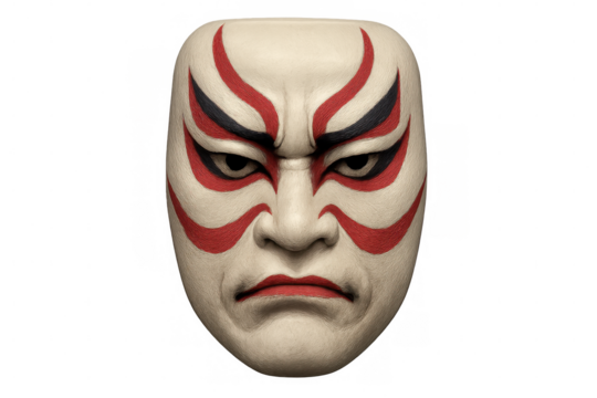 Close-up of a japanese noh mask featuring kumadori makeup, isolated on a transparent background