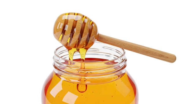 A close-up shot of honey in a jar with a wooden honey dipper for culinary use. transparent background.
