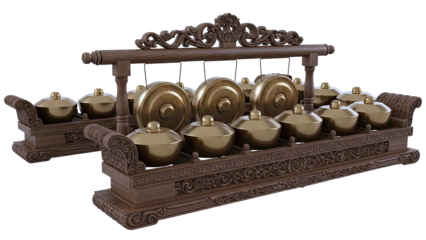 Bronze Gamelan Musical Instrument Set with Ornate Wooden Stand