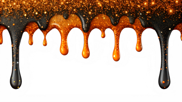 Dripping glossy halloween black orange slime texture isolated on transparent background illustration. Border of flowing sticky sweet goo. Cream, jelly or caramel glaze for cake , donut,PNG