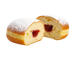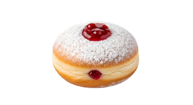 Delicious sufganiyah isolated on transparent background, a traditional hanukkah jelly donut filled with strawberry jam and sprinkled with powdered sugar