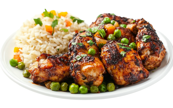 A plate of fresh Caribbean jerk chicken served with rice and flavorful side dishes Isolated on transparent background PNG