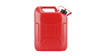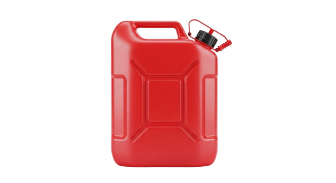 A vibrant red plastic gas can, commonly used for storing and transporting fuel, stands upright with its spout visible, isolated on a clean transparent background
