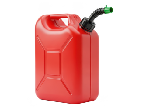 Red jerry can with spout and green nozzle on top isolated on transparent background