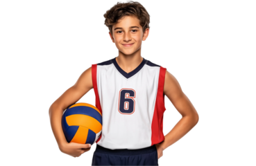 Youth boy volleyball player in jersey number 16 smiling on isolated background