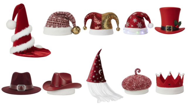 Isolated Collection of Red and Burgundy Holiday, Christmas, and Costume Hats