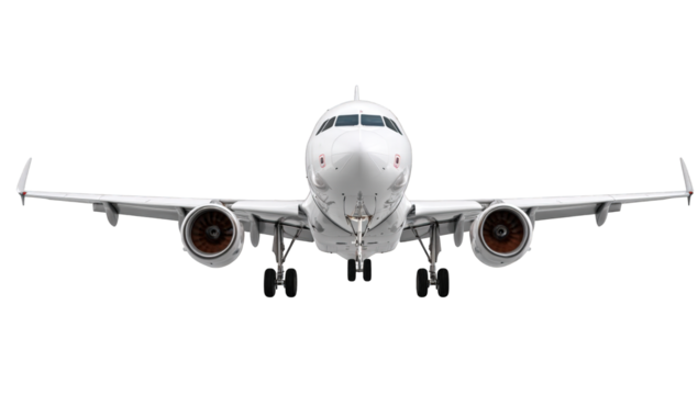 transparent commercial passenger jetliner banking upward, showing extended landing gear and powerful jet engines, isolated on a seamless transparent studio background. Concept of global air travel