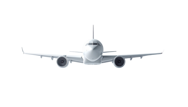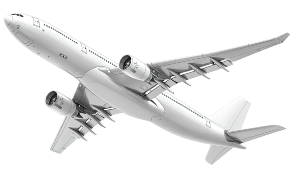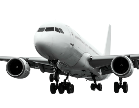 transparent commercial passenger jetliner banking upward, showing extended landing gear and powerful jet engines, isolated on a seamless transparent studio background. Concept of global air travel