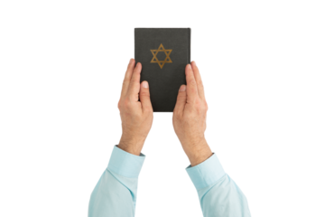 Hands and Hebrew Book Talmud with Star of David on a dark cover on isolated background. Rabbinic Judaism, Studying Jewish religious law. Torah, Hebrew Bible. Holy Scripture containing the word of God