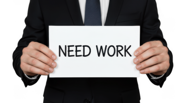 Man Holding 'NEED WORK' Sign – Transparent PNG Background