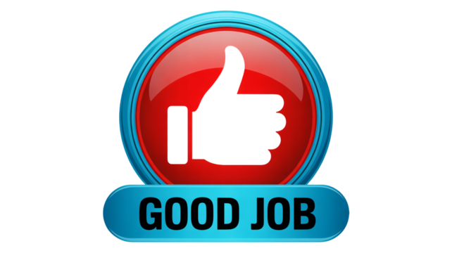 Thumbs up icon in red circle with blue border and good job text in flat design for social media