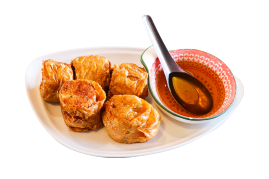 Hoi jo crab rolls or crab jujube places With delicious plum sauce and spoon on white tiled dish isolated on cut out PNG or transparent background. Thai people called Hoi-cho local traditional style.