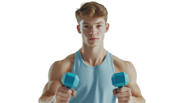 Male jock with pronounced biceps flexed to show strength, on a clean white background