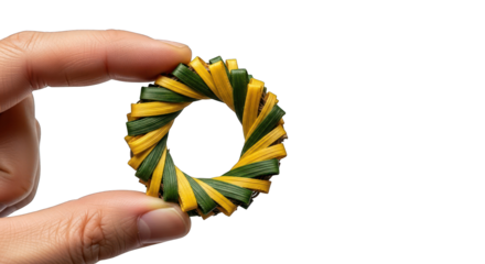 Hand holding a colorful twisted ring toy against a white background.