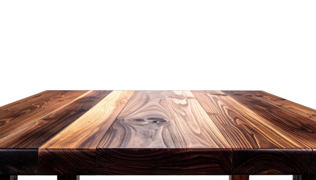 Close-up of a richly grained, dark wood tabletop against a black background.