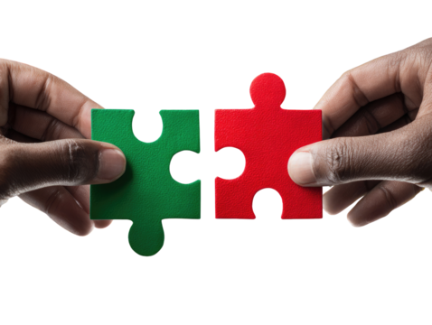 Two hands connecting red and yellow puzzle pieces against black isolated on a transparent background