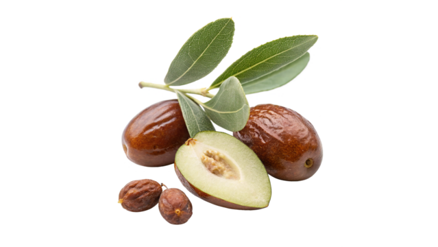 Fresh jojoba fruit and halved slice of jojoba with its stem and leaves isolated on white background. Suitable for marketing or business purposes. PNG file