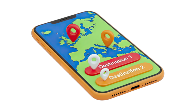Isometric map showing 3d mountain terrain with glowing route and location pins, navigating a complex journey on transparent background