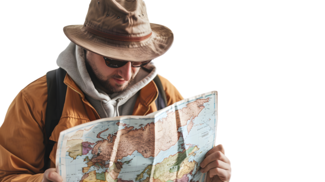 Digital folded map on transparent background for travel journeys