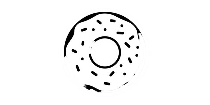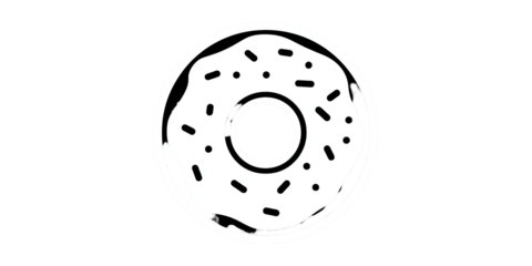 Black and white illustration of a donut with sprinkles, top-down view, on a black background