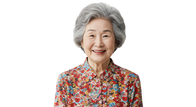 Elderly Asian Woman Wearing Floral Dress, Smiling Warmly Against Black Background, Showcasing Grace and Wisdom at an Advanced Age