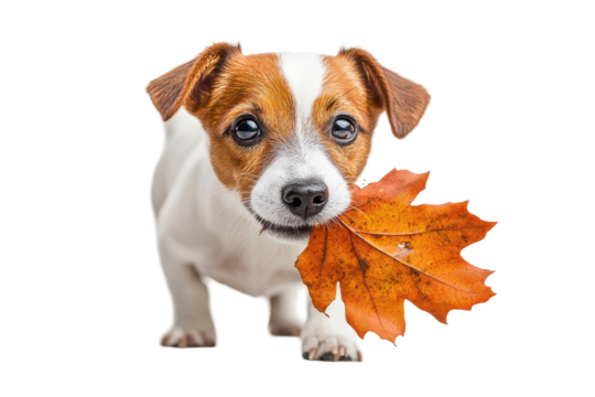 Dog holding a colorful autumn leaf in its mouth with a joyful expression, showcasing a playful interaction with nature during fall season
