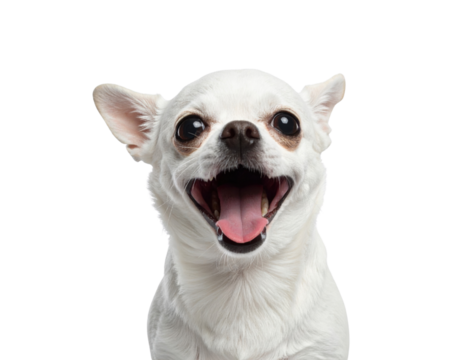 A smiling white Chihuahua with large expressive eyes, showcasing its playful and friendly demeanor.