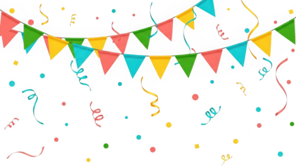 Festive Party Bunting Flags with Colorful Streamers and Confetti for Birthday and Holiday Celebration Backdrop Isolated on White