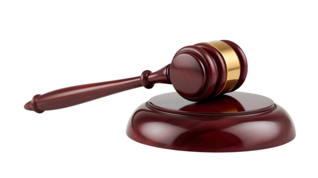 Wooden gavel used in courtroom hearings isolated on transparent bg, cutout png