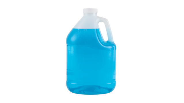 Large plastic jug with blue liquid and a handle. Isolated on transparent background, png