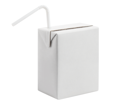 White juice box carton with straw on transparent background