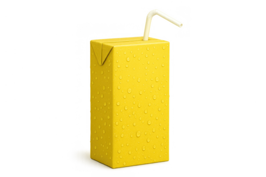 Yellow juice box with straw and water drops, refreshing beverage carton for kids, transparent background