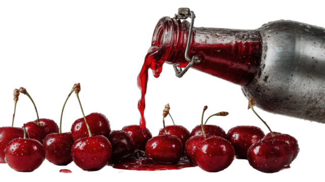 red cherry juice pouring from vintage glass bottle over fresh cherries dramatic splash close up isolated on white background