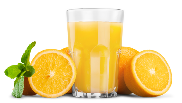 Smiling woman holding glass of refreshing orange juice on transparent background