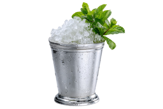 A refreshing mint julep with ice in a silver cup isolated on transparent background