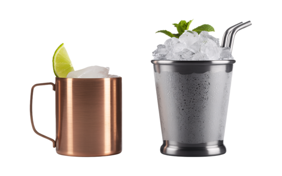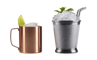 Copper mug and metal cup with ice and garnishes on white background Moscow Mule julep cup