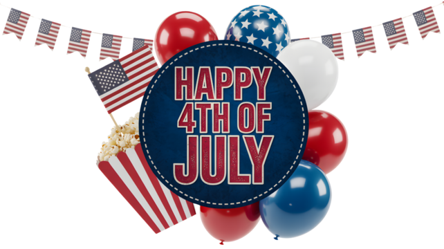 A joyful happy 4th of july celebration with patriotic balloons, flag, bunting, and popcorn isolated on transparent background