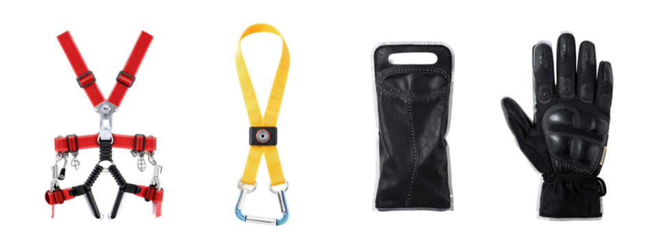 Photograph of four items: red and black leather harness with metal chains, yellow strap with black buckle, black leather glove with textured wrist, and black leather glove with stitching.