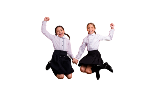 Full length body size view of two person nice attractive charming cute excited cheerful cheery positive pre-teen girls having fun rejoice September isolated on bright vivid shine orange background