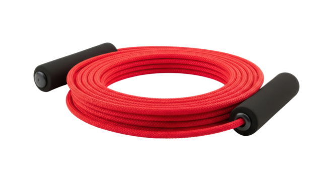 Black jump rope with textured handles and coiled cable, set against black backdrop