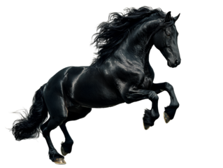 Black horse in mid jump over invisible obstacle isolated on a transparent background